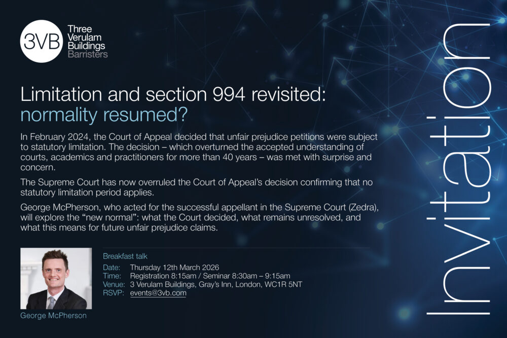 Following the Supreme Court judgment in THG Plc v Zedra Trust Company (Jersey) Ltd: [2026] UKSC 6, which was handed down on 25 February 2026, please join us for a Breakfast Talk on “Limitation and section 994 revisited: normality resumed?”
